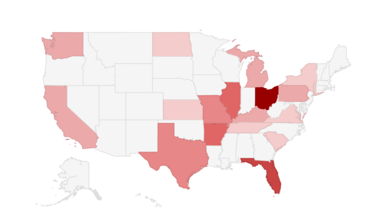 We also found 43 doctors who were outliers in performing vertebroplasties. They did at least 100 vertebroplasties meeting overuse criteria over three years, and performed at least 50% of the total vertebroplasties at a high-overuse hospital. These doctors are clustered in the Midwest and South, with the most in Ohio, Florida, Arkansas, Illinois.